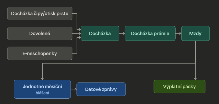 Modul Mzdy představuje komplexní systém pro správu mezd zaměstnanců a zahrnuje několik vzájemně propojených modulů. Postup začíná evidencí a potvrzením docházky zaměstnanců, pokračuje zadáním prémií, výpočtem a schválením mezd, odesláním povinných hlášení státním institucím (ČSSZ, zdravotní pojišťovny) a končí distribucí výplatních pásek zaměstnancům.