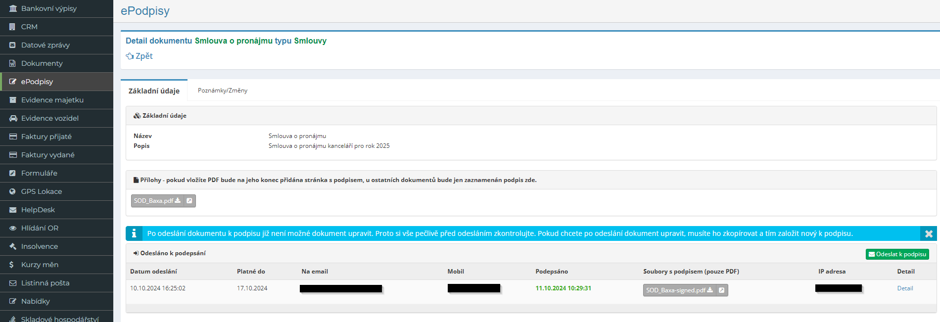 - Auditní stopa: Každý podpis je provázán s časovým razítkem a IP adresou, takže můžete snadno doložit pravost dokumentu v případě potřeby.